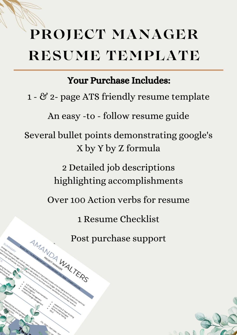 One of the first interactions/impressions you’ll have with a prospective employer is your resume. Employer spend about 5 to 30 seconds when initially screening resumes so it’s important to make a great first impression so you’re not eliminated from consideration. Use this, ATS friendly Project Manager resume template to catch the attention of recruiters and hiring managers.